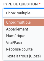 Par exemple, pour une activité Test sur Éléa, vous avez le choix parmi plusieurs type de question :